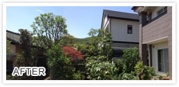 伐採により玄関前が明るくなり、高木も中の枝透かしを行ったのでお庭が軽くなりました。