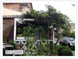 カテゴリ 植木の手入れ 施工内容 伐採 お悩み 日よけにしていたフジの木が屋根に進入してきて困っている。害虫の営巣になりそう。 概要 フジ伐採